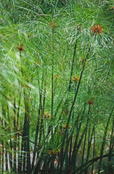 Cyperus papyrus, or Papyrus, is a fast-growing grass, 5-10 ft tall, thrives in wet loamy soil, full sun, high moisture, not edible, and has no medicinal uses.
