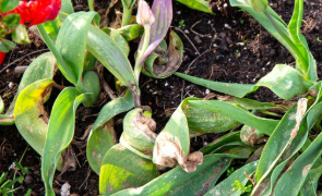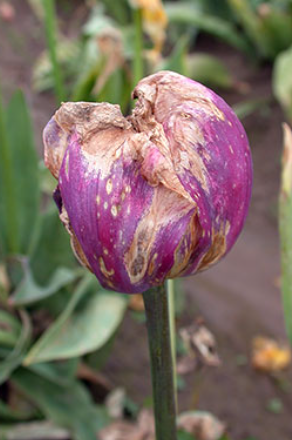 Gray mold on flowers and leaves, Yellowing, wilting leaves, stunted growth, Leaf spots, flower distortion, gray mold, Rotting at the base of the bulb, wilting Mottled leaves, stunted growth.