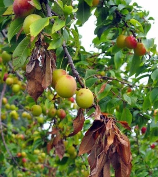 shoots , flowers and fruits wilt , blacken and die , affected leaves become twisted or puckered , circular spots on their upper surface.