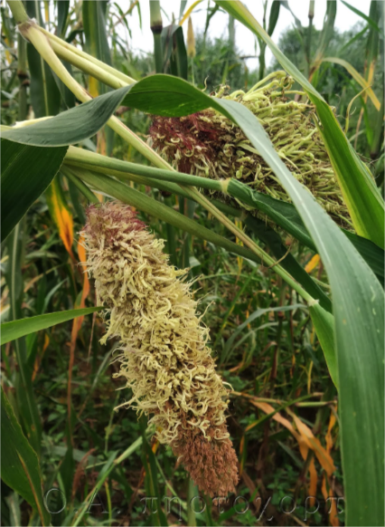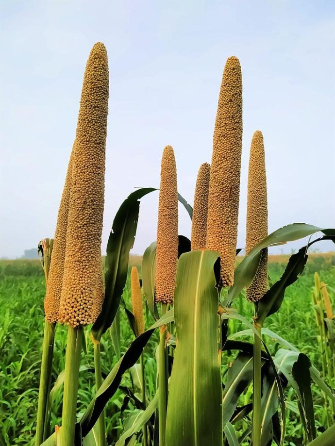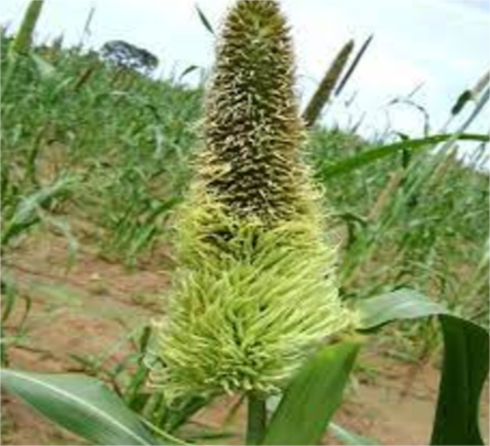 | Pearl Millet (Pennisetum glaucum) grows up to 12 ft, thrives in well-drained soil, full sun, moderate moisture, edible but not medicinal. |