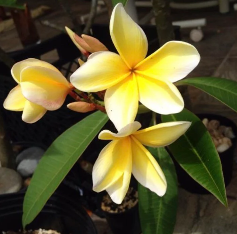 Pele's Gold (Plumeria rubra 'Pele's Gold'), a deciduous tropical shrub/tree, grows 3-6 m with moderate growth in well-drained sandy soil, thrives in full sun with moderate moisture, is non-edible with no medicinal benefits, and produces 3-3.5 inch multicolored (yellow, orange, pink) flowers with a sweet fragrance in summer-fall.