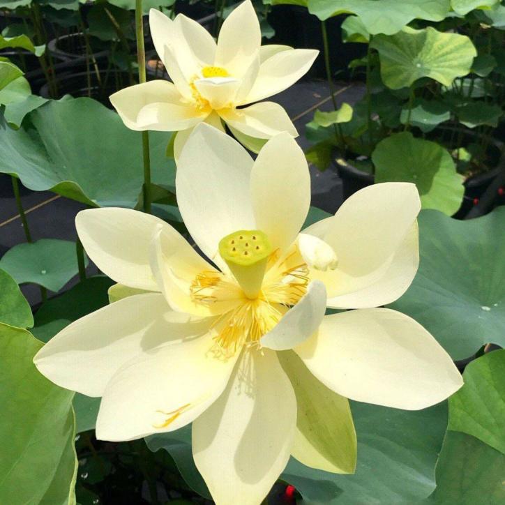 A large, hybrid lotus with bright yellow, double-petaled, fragrant blooms up to 12 inches, ideal for large ponds with edible parts and vibrant aesthetics.