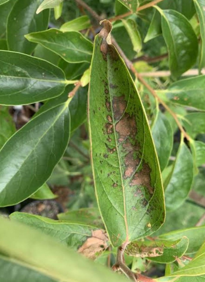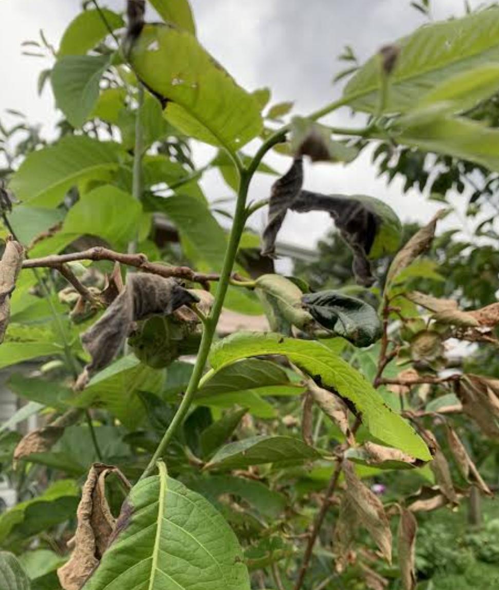 This disease is caused by the fungus Colletotrichum. It starts as small spots and develops into angular lesions that can sometimes affect the fruit. The leaves turn yellow and fall off the tree early. This may indicate that the leaves are infested with pests such as aphids. This may indicate a pH imbalance in the soil.