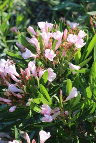 Petite Pink (Nerium oleander 'Petite Pink'), a Mediterranean evergreen shrub, grows 0.9-1.2 m with moderate growth in well-drained sandy-loam, thrives in full sun with low to moderate moisture, is non-edible and toxic with no medicinal benefits, and produces non-fragrant pink single flowers in summer.