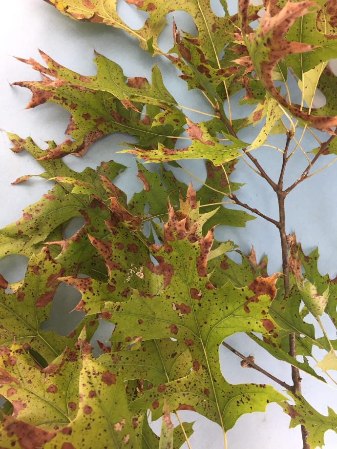 Wilting, browning leaves, often on one side of the tree; discolored vascular tissue beneath the bark.