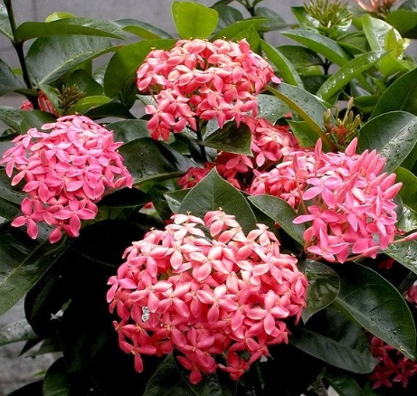 Pink Delight (Ixora 'Nora Grant'), a tropical evergreen hybrid shrub, grows 1.2-2.4 m with moderate growth in well-drained acidic soil, thrives in full sun with moderate to high moisture, is non-edible with no medicinal benefits, and produces pinkish-red flower clusters year-round.