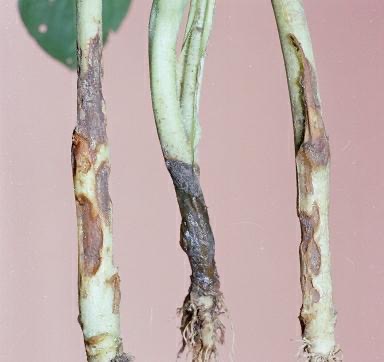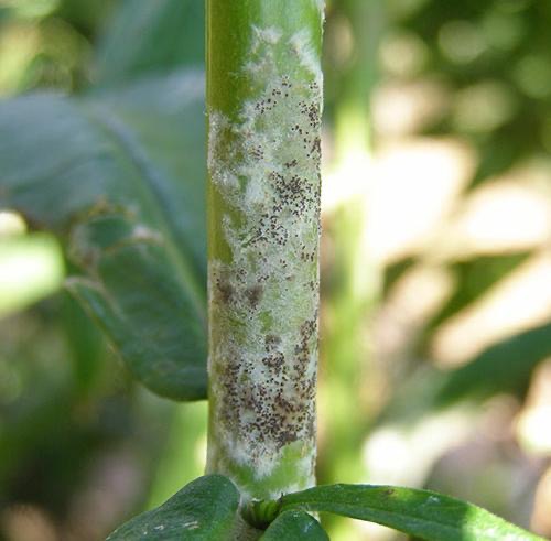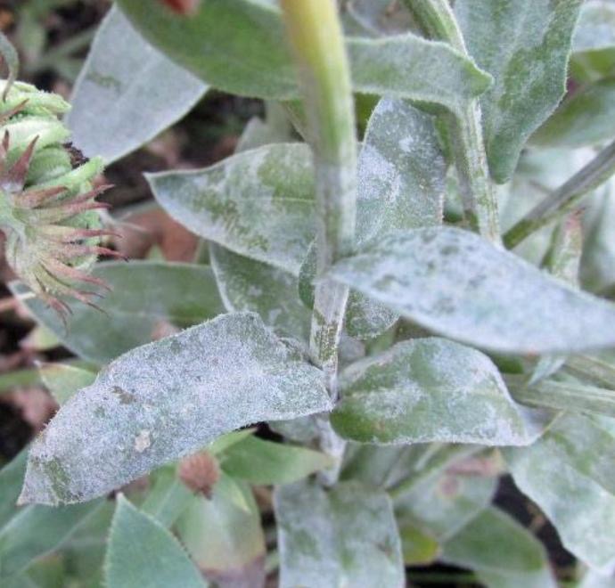 White powdery growths on leaves, stems, and petioles which then leads to necrosis as the disease progresses. Infection generally starts in the shaded areas of plants on older leaves, but this diseases can quickly cover entire plants.