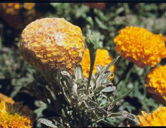 White powdery growth on leaves, Gray, fuzzy mould on leaves and flowers, Yellowing leaves, sticky residue on leaves, White, winding trails on leaves, Brown or black stem lesions.