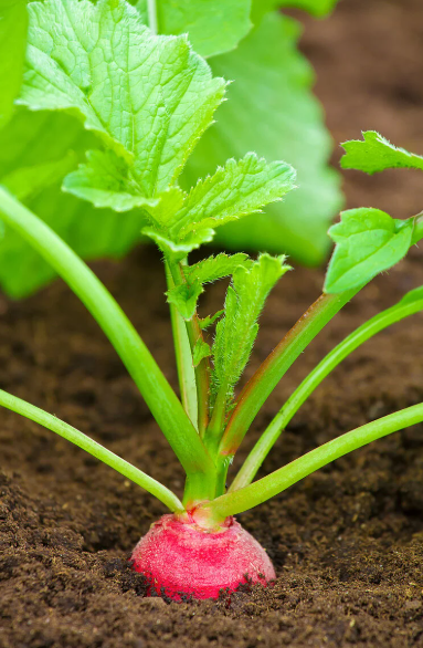 Radish microgreens (Raphanus sativus), fast-growing annuals up to 2-3 inches, grow in peat-based soil with partial shade, are edible with a spicy flavor, and provide vitamin C and digestive benefits, originating from Asia.