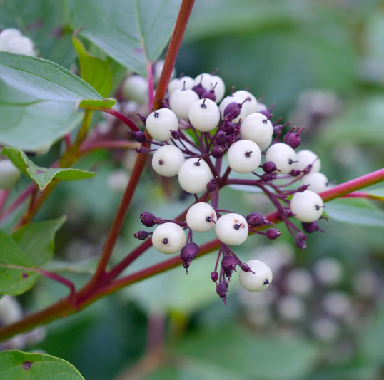 Red Twig Dogwood (Cornus sericea) is a shrub that grows 5-9 ft tall, hardy in USDA Zones 2-8, prefers moist, well-drained soil, full sun to part shade, medium to high moisture, not edible, and has medicinal uses.