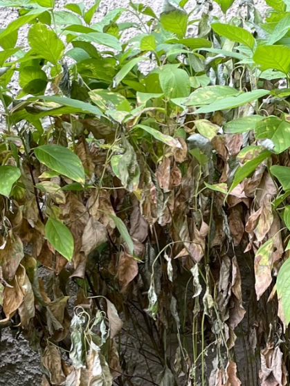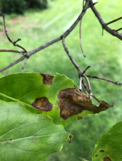 Leaf spots, twig dieback, Dark spots on leaves, White, powdery growth on leaves, Branch dieback, sunken lesions, Orange or yellow spots on leaves