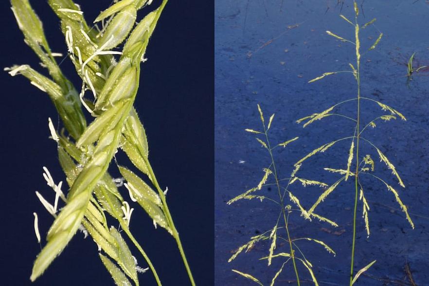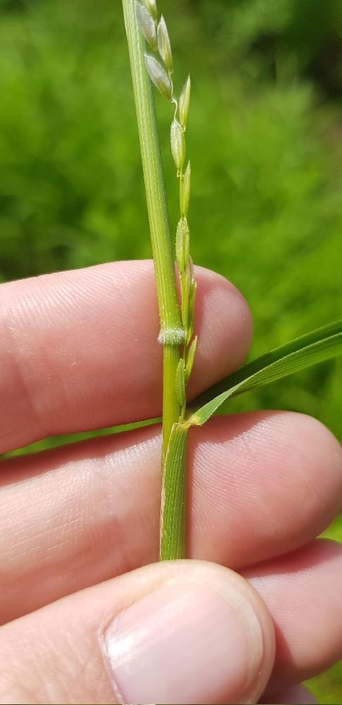 Rice Cutgrass (Leersia oryzoides) grows up to 3 ft, thrives in moist soil, partial shade, high moisture, and is neither edible nor medicinal.