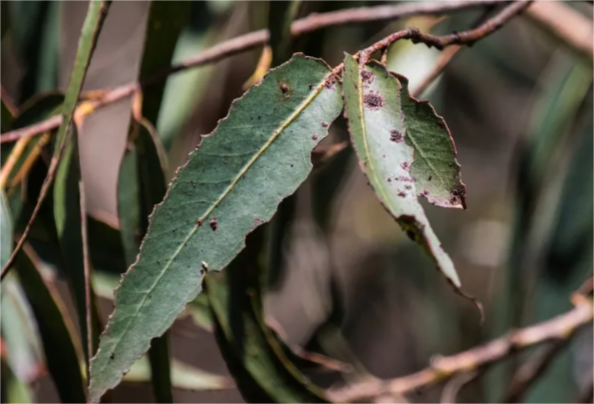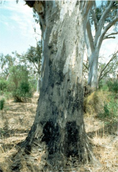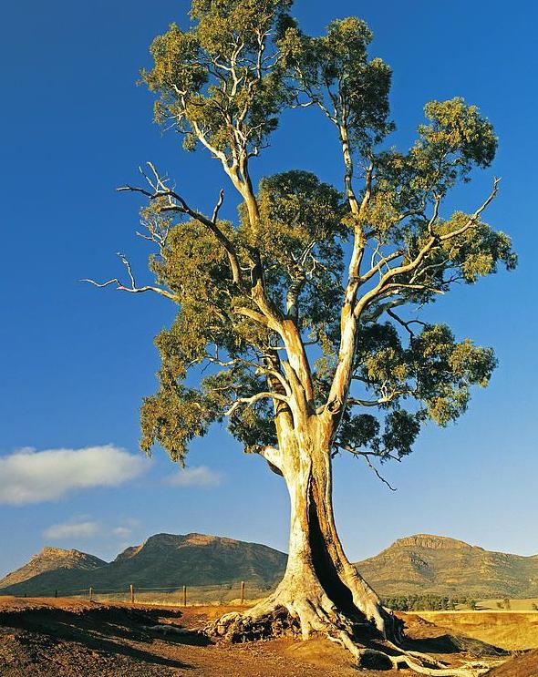 | River Red Gum (Eucalyptus camaldulensis) grows up to 50 ft, thrives in well-drained soil, full sun, low moisture, and is not edible but has medicinal uses. |