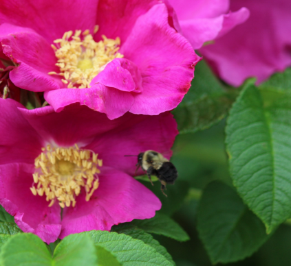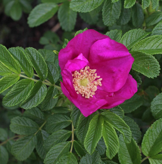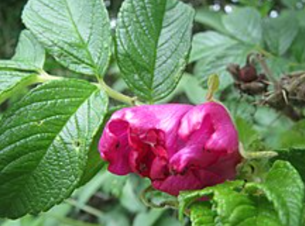 Rosa rugosa 'Beach', a rugged shrub, reaches 1.2-1.8 m, with pink or white, fragrant flowers and edible hips, salt-tolerant, ideal for coastal gardens.