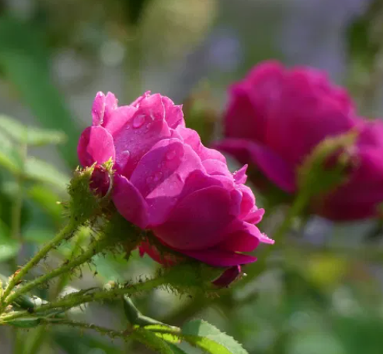 Rosa 'Henri Martin', a Gallica rose, reaches 1.2-1.5 m in full sun to part shade, with fragrant, crimson-pink flowers in late spring, historically used for medicinal purposes.