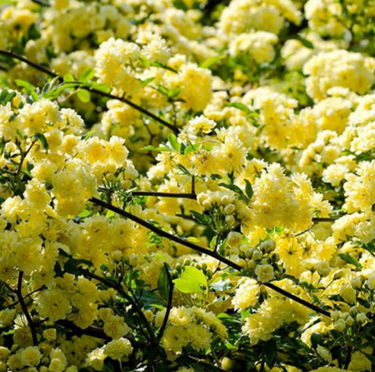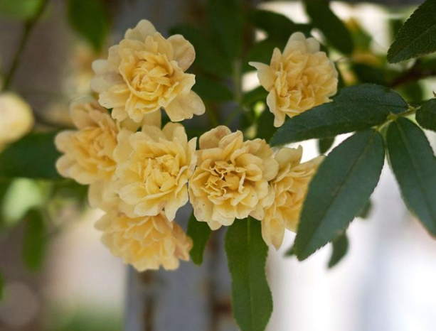 Rosa banksiae, a thornless climber, reaches 6.0-12.0 m, with small, yellow or white, lightly scented flowers, blooms once, ideal for arbors with moderate moisture and no medicinal usage.