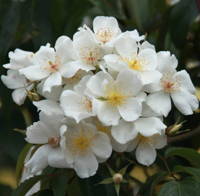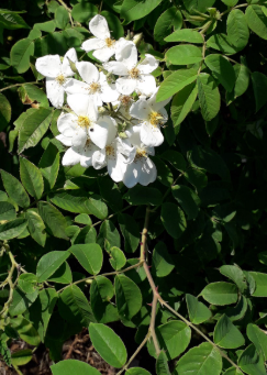 Rosa moschata, a musk rose, reaches 3.0-6.0 m, with white, musky-scented flowers, blooms late, used in perfumes and medicine with moderate moisture and medicinal usage.
