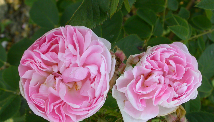 Rosa 'Alba Maxima', an Alba rose, reaches 1.5-2 m in full sun to part shade, with fragrant, double white flowers in spring, historically used for medicinal purposes.