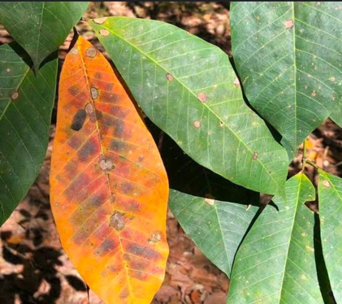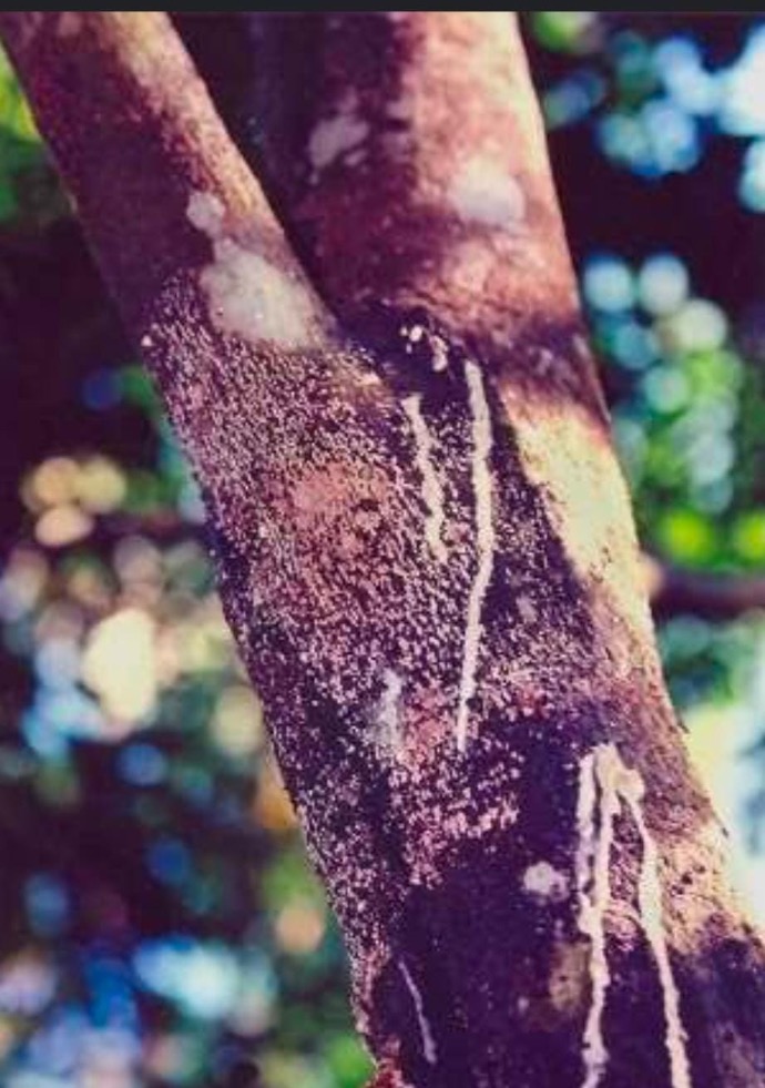 leaf defoliation , young leaves covered with powdery mildew . Pink colour mycelia growth on bark surface .