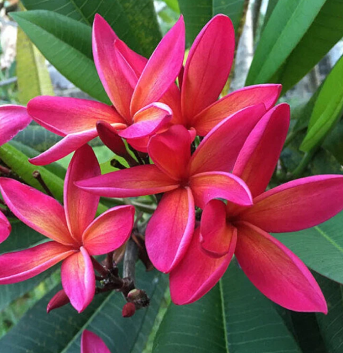 Ruby (Plumeria rubra 'Ruby'), a deciduous tropical shrub/tree, grows 2.4-4.8 m with moderate growth in well-drained sandy soil, thrives in full sun with moderate moisture, is non-edible with no medicinal benefits, and produces 3-3.5 inch dark pink/red flowers with a spicy fragrance in summer-fall.