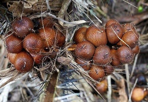 The fruit grows from the base of the palm and is also called snake fruit because its skin is red-brown and scaly. The fruit is similar in size and shape to a ripe berry and has a crisp, moist consistency.