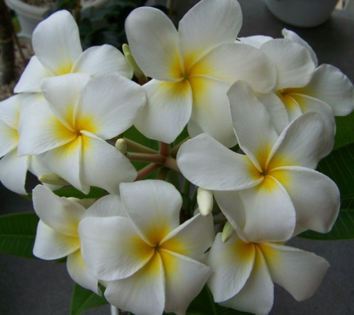 Samoan Fluff (Plumeria rubra 'Samoan Fluff'), a deciduous tropical shrub/treetree, grows 3-6 m with moderate growth in well-drained sandy soil, thrives in full sun with moderate moisture, is non-edible with no medicinal benefits, and produces fluffy white and yellow flowers with overlapping petals and a sweet fragrance in summer-fall.