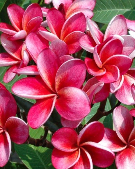 Sangria (Plumeria rubra 'Sangria'), a deciduous tropical shrub/tree, grows 3-6 m with moderate growth in well-drained sandy soil, thrives in full sun with moderate moisture, is non-edible with no medicinal benefits, and produces 3-3.5 inch deep red-wine flowers with a fruity fragrance in summer-fall.