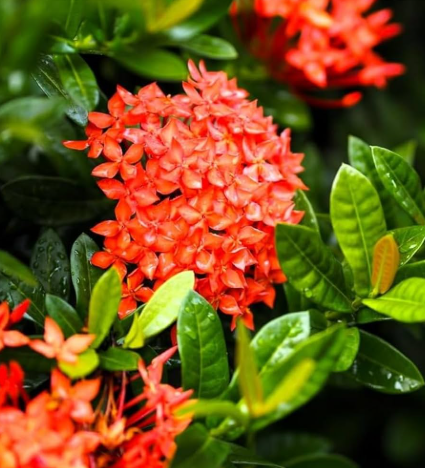 Scarlet Beauty (Ixora 'Scarlet Beauty'), a tropical evergreen hybrid shrub, grows 1.2-1.8 m with moderate growth in well-drained acidic soil, thrives in full sun with moderate to high moisture, is non-edible with no medicinal benefits, and produces scarlet flower clusters year-round.