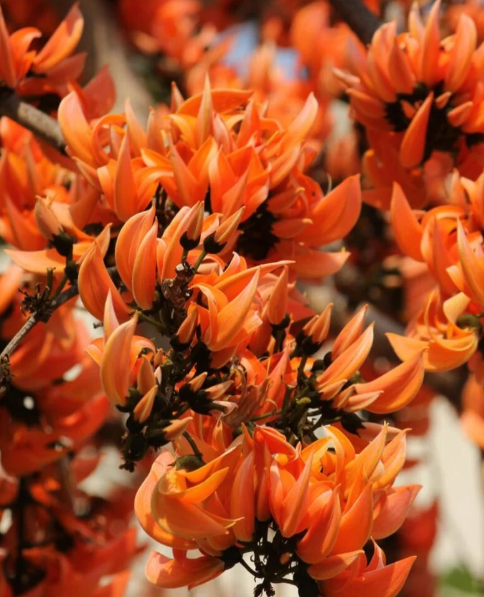 Scarlet Palash (Butea monosperma var. monosperma), a deciduous tree, grows 10-15 m with slow growth in well-drained sandy-loam soil, thrives in full sun with low moisture, is non-edible with medicinal benefits, and produces 2.5 cm scarlet flowers in Feb-Apr.