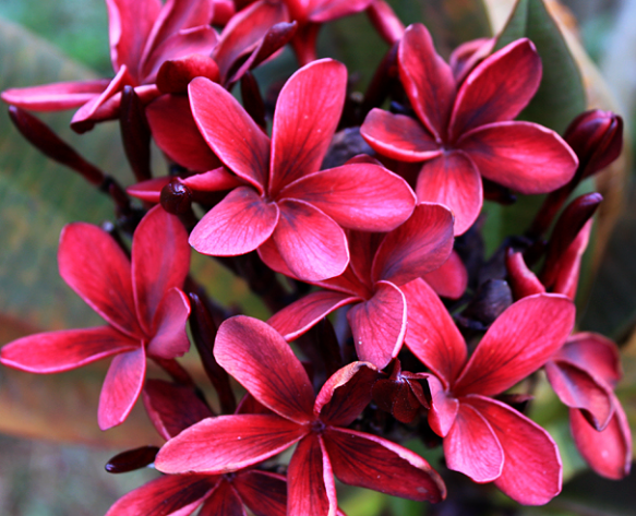 Scott Pratt (Plumeria rubra 'Scott Pratt'), a deciduous tropical shrub/treetree, grows 3-6 m with moderate growth in well-drained sandy soil, thrives in full sun with moderate moisture, is non-edible with no medicinal benefits, and produces small dark maroon flowers with dark veins and a spicy scent in summer-fall.
