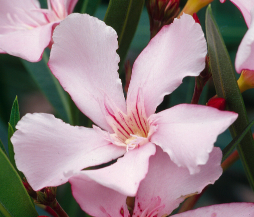 Sealy Pink (Nerium oleander 'Sealy Pink'), a Mediterranean evergreen shrub, grows 1.8-2.4 m with vigorous growth in well-drained sandy-loam, thrives in full sun with low to moderate moisture, is non-edible and toxic with no medicinal benefits, and produces early-blooming single pastel pink flowers with coral streaks in summer.