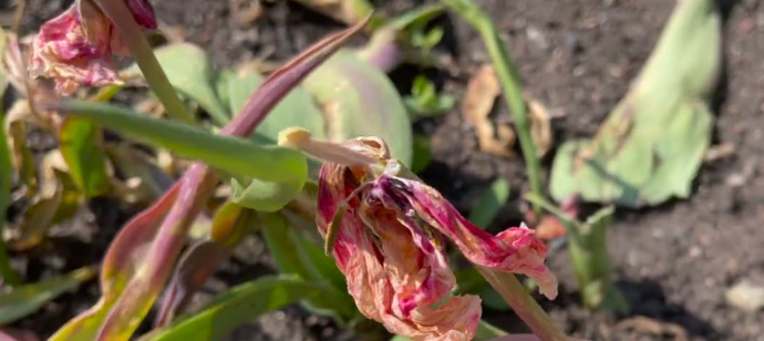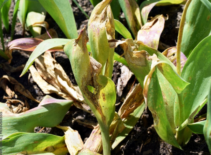 Gray mold on flowers and leaves, Yellowing, wilting leaves, stunted growth, Leaf spots, flower distortion, gray mold, Rotting at the base of the bulb, wilting Mottled leaves, stunted growth.