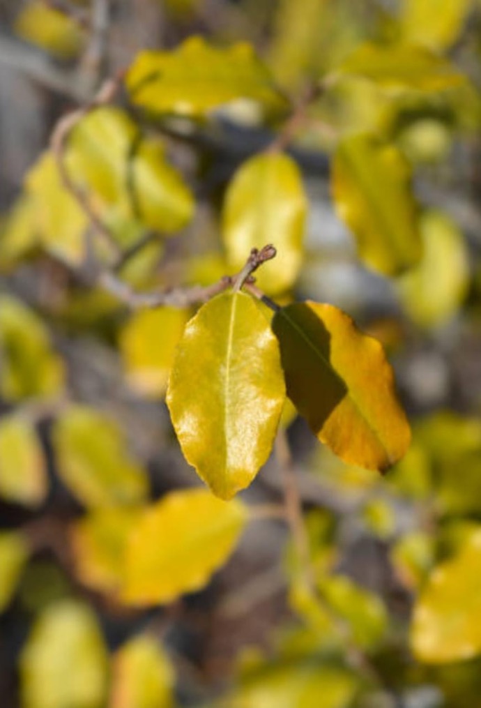 Leaves are deciduous, simple, alternate, 2-10 cm long, ovate to oblong or ovate- lanceolate, wedge-shaped at base, short petioled, both surfaces covered by minute, silver scales, sometimes with scattered brown scales beneath.