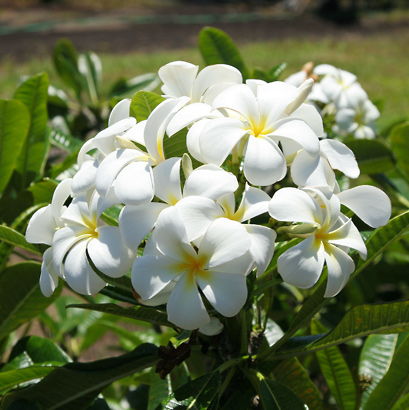 Singapore (Plumeria obtusa 'Singapore'), an evergreen tropical shrub/tree, grows 1.8-6 m with moderate growth in well-drained sandy soil, thrives in full sun with moderate moisture, is non-edible with no medicinal benefits, and produces white flowers with yellow centers and a sweet fragrance in summer-fall.
