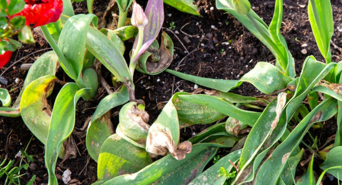 Gray mold on flowers and leaves, Yellowing, wilting leaves, stunted growth, Leaf spots, flower distortion, gray mold, Rotting at the base of the bulb, wilting Mottled leaves, stunted growth.