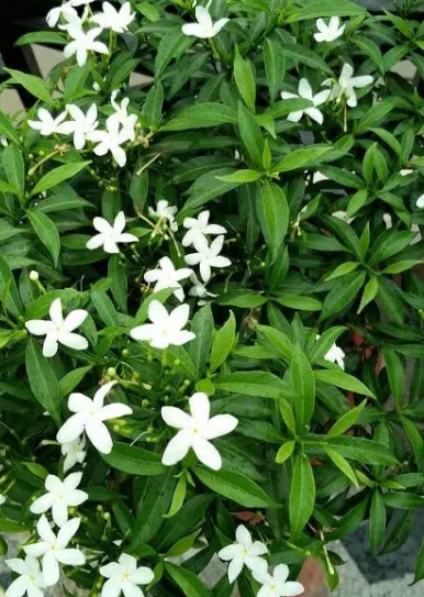 Single Flowered Tagar (Tabernaemontana divaricata) is a perennial evergreen shrub from South Asia, growing 1.5–1.8 m with moderate growth in well-drained soil, thriving in tropical climates with full sun to partial shade, requiring moderate moisture and offering sedative medicinal benefits.