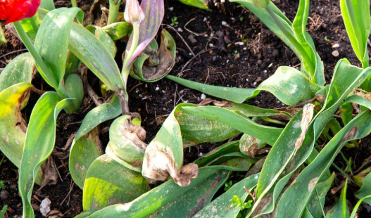 Gray mold on flowers and leaves, Yellowing, wilting leaves, stunted growth, Leaf spots, flower distortion, gray mold, Rotting at the base of the bulb, wilting Mottled leaves, stunted growth.