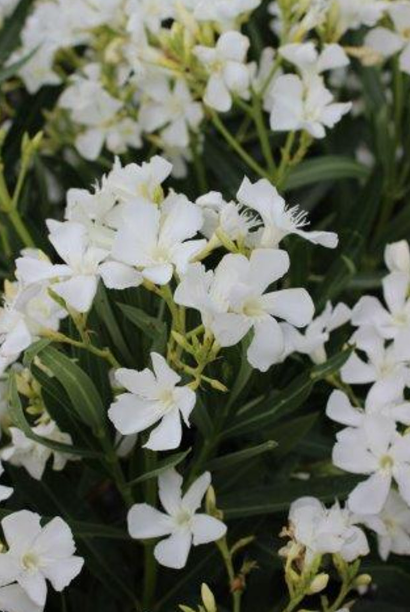 Sister Agnes (Nerium oleander 'Sister Agnes'), a Mediterranean evergreen shrub, grows 1.8-2.4 m with vigorous growth in well-drained sandy-loam, thrives in full sun with low to moderate moisture, is non-edible and toxic with no medicinal benefits, and produces single pure white flowers in summer.