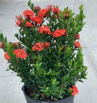 Sunrise (Ixora 'Sunrise'), a tropical evergreen hybrid shrub, grows 1.2-1.8 m with moderate growth in well-drained acidic soil, thrives in full sun with moderate to high moisture, is non-edible with no medicinal benefits, and produces orange-yellow flower clusters year-round.