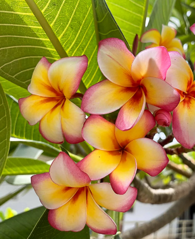 Sunset (Plumeria rubra 'Sunset'), a deciduous tropical shrub/tree, grows 3-6 m with moderate growth in well-drained sandy soil, thrives in full sun with moderate moisture, is non-edible with no medicinal benefits, and produces 3-3.5 inch orange-yellow-pink flowers with a sweet fragrance in summer-fall.