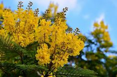 Peltophorum pterocarpum - Copper pod. Copperpod is sometimes called yellow flame tree because its fern-like leaves resemble gulmohar leaves. It is a very beautiful tree with a spreading crown consisting of many branches with pinnate leaves similar to mimosa, and many bright yellow flowers.