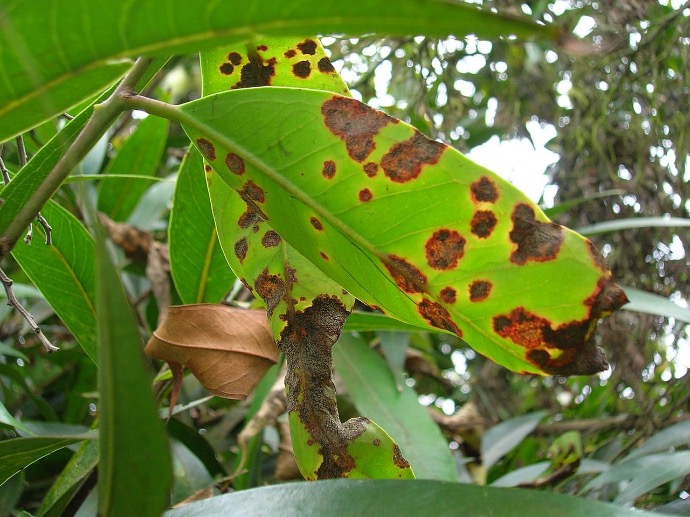 Leaf spot began as a black dot with a distinct yellow halo. These dots enlarged to a diameter of 3 to 5 mm and progressed to form deep brown, circular, elliptical or irregular lesions with a dark black halo around the margin