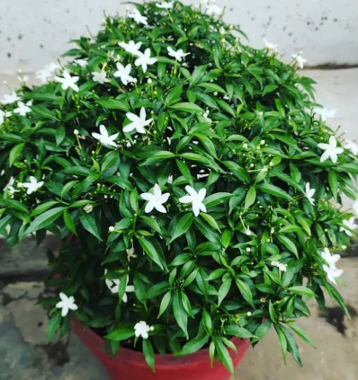 Tagar 'Compacta' (Tabernaemontana divaricata 'Compacta'), a compact South Asian evergreen shrub, grows 0.9-1.2 m with slow to moderate growth in well-drained sandy-loam, thrives in full sun to partial shade, requires moderate watering, is non-edible with sedative and anxiolytic benefits, and blooms year-round with fragrant white flowers.