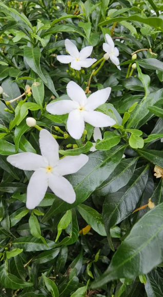 Tagar 'Flore Pleno' (Tabernaemontana divaricata 'Flore Pleno'), an evergreen South Asian shrub, grows 1.5-2 m with moderate growth in well-drained sandy-loam, thrives in full sun to partial shade, needs moderate moisture, is non-edible with sedative and digestive benefits, and blooms year-round with fragrant double white flowers.