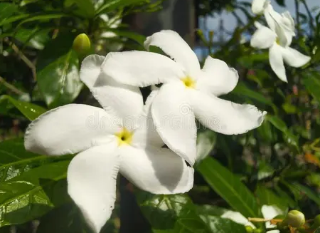 Tagar 'Gardenia Mimic' (Tabernaemontana divaricata 'Gardenia Mimic'), a South Asian evergreen shrub, grows 1.5-2 m with moderate growth in well-drained sandy-loam, thrives in full sun to partial shade with moderate moisture, is non-edible with sedative and digestive benefits, and produces year-round large, gardenia-like white flowers.