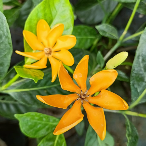 Tagar 'Golden Edge' (Tabernaemontana divaricata 'Golden Edge'), a South Asian evergreen shrub, grows 1.5-1.8 m with moderate growth in slightly acidic well-drained soil, thrives in full sun to partial shade, needs moderate moisture, is non-edible with calming and bactericidal benefits, and blooms year-round with fragrant white flowers and golden-edged variegated leaves.