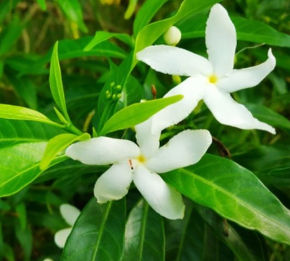 Tagar 'Grandiflora' (Tabernaemontana divaricata 'Grandiflora'), a South Asian evergreen shrub, grows 1.8-2.4 m with moderate growth in well-drained sandy-loam, thrives in full sun to partial shade, needs moderate moisture, is non-edible with sedative and digestive benefits, and produces large, fragrant white flowers year-round.
