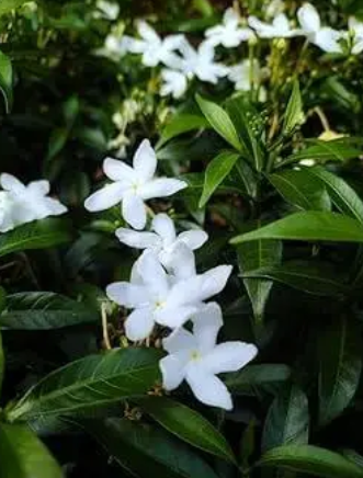 Tagar 'Grandiflora' (Tabernaemontana divaricata 'Grandiflora'), a South Asian evergreen shrub, grows 1.8-2.4 m with moderate growth in well-drained sandy-loam, thrives in full sun to partial shade, needs moderate moisture, is non-edible with sedative and digestive benefits, and produces large, fragrant white flowers year-round.