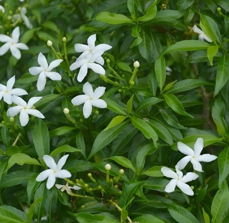 Tagar 'Nana' (Tabernaemontana divaricata 'Nana'), a South Asian compact evergreen shrub, reaches 0.6-1 m with slow to moderate growth in well-drained sandy-loam, prefers full sun to partial shade, requires moderate watering, is non-edible with sedative and anxiolytic properties, and blooms year-round with fragrant white flowers.