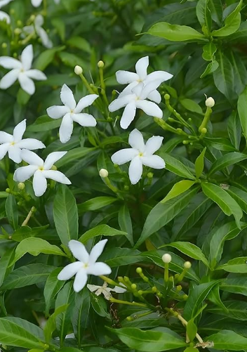 Tagar 'Nana' (Tabernaemontana divaricata 'Nana'), a South Asian compact evergreen shrub, reaches 0.6-1 m with slow to moderate growth in well-drained sandy-loam, prefers full sun to partial shade, requires moderate watering, is non-edible with sedative and anxiolytic properties, and blooms year-round with fragrant white flowers.